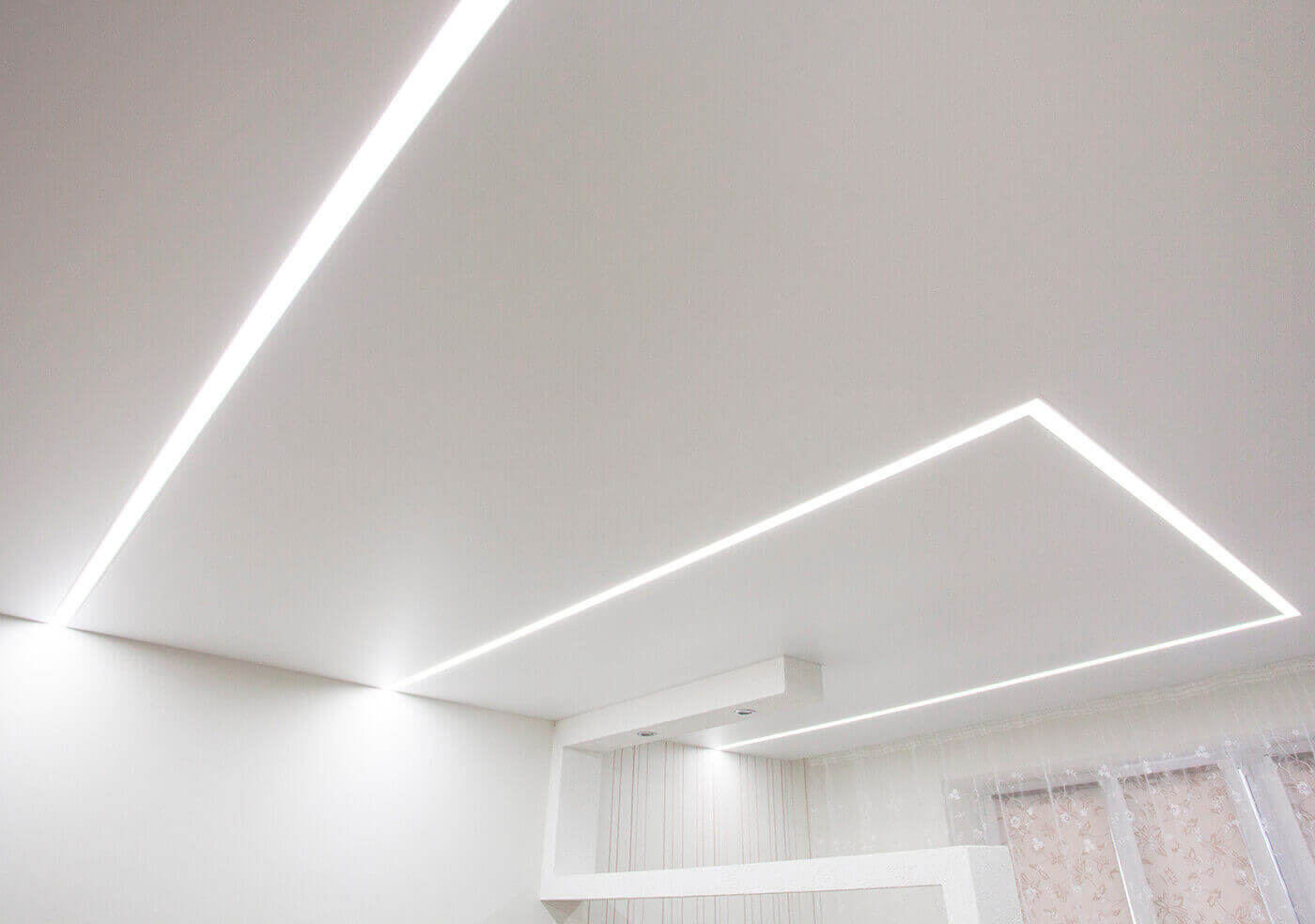 Конструкции отлично впишутся в продолговатые комнаты: длинные залы, гостиные и коридоры. Двухуровневые натяжные потолоки продолговатой формы очень эффектно смотрятся с применением светодиодной ленты. Для нижнего уровня чаще используются матовые или сатиновые полотна, а в центре эффектно смотрится глянец или фактурные потолотна.